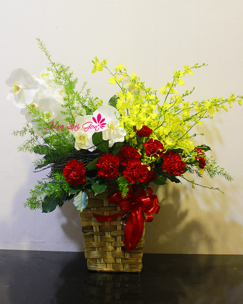 Lấy ý tưởng về ngày bình yên và hạnh phúc Hoa Sài Gòn đã cho ra đời giỏ hoa Mừng ngày hạnh phúc. Giỏ hoa chúc mừng Mừng ngày hạnh phúc là sự kết hợp từ những cành lan vũ nữ màu vàng, cẩm chướng đỏ, lan hồ điệp trắng cùng nhiều cành lá phụ khác để tạo nên. Đây chính là món quà thân thương và ý nghĩa thể hiện lời chúc chân thành từ trái tim làm ngất ngây mọi tâm hồn.