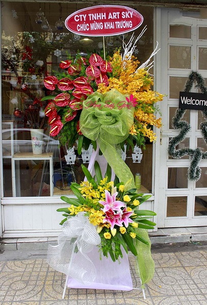 Và Hoa Sài Gòn xin gửi đến các bạn mẫu hoa khai trương Con đường thành công. Kệ hoa đơn giản nhưng nhưng vô cùng ý nghĩa mà bạn có thể dành tặng nhân ngày khai trương công ty, cửa hàng, shop. Kệ hoa là sự kết hợp giữa rất nhiều những đóa hoa như là hồng môn, lan mokara vàng, hoa lily hồng, hoa hồng vàng kèm với phụ kiện màu xanh và trắng tạo nên.