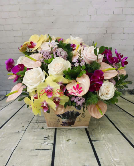 Hộp hoa thiếc Ngọc ngà chính là món quà xinh đẹp mà bạn có thể dành tặng cho những người thân yêu của mình nhân dịp 20/10 sắp đến. Đây chính là sự kết hợp từ những đóa hoa bạch môn, hoa hồng da, hoa lan hồ điệp cùng nhiều hoa lá phụ khác.