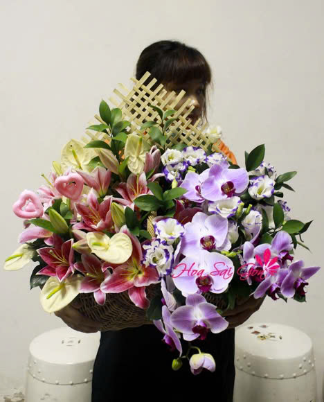 Giỏ hoa Lời tự tình chính là sự kết hợp độc đáo giữa những cành lan hồ điệp màu tím, những đóa hoa ly hồng ngát hương cùng với những đóa bạch môn tinh khôi và những đóa cát tường tím.