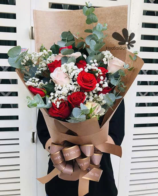 Bó hoa gồm 12 hồng đỏ, 8 hồng da kết hợp với baby trắng và lá bạc.