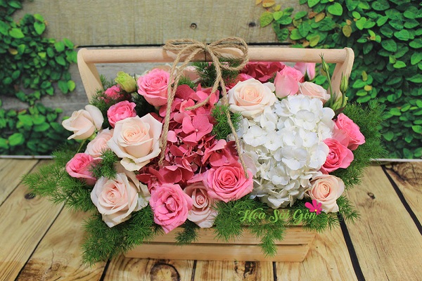 Sắc hồng luôn mang đến cho người nhận những điều nhẹ nhàng và đôi lúc chúng ta cần lãng mạn để cuộc sống thêm phần thi vị. Cũng chính vì vậy mà hộp hoa Bên em mãi mãi HSG240 với gam màu hồng chủ đạo của những đóa cẩm tú cầu hồng, hoa hồng dâu, hồng da nổi bật trên nền xanh của thiên môn và cẩm tú cầu trắng như một thông điệp về tình yêu lãng mạn và ý nghĩa mà người tặng muốn gửi trao đến người nhận.