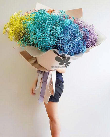 Baby nhập tươi lâu, bó hoa là sự kết hợp baby vàng, xanh ngọc, xanh dương, hồng, tím như một bản tình ca anh mãi dành tặng em.