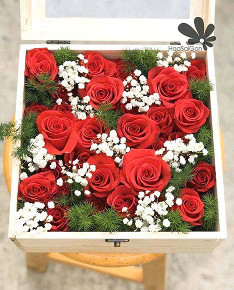 Chiếc hộp tình yêu HSG302 chứa đựng tâm tư tình cảm dành cho người mình yêu thương. Hộp hoa với 32 bông hồng đỏ phối với hoa baby trắng và lá xanh xinh xắn. Hộp gỗ với nắp kiếng trang trọng, cuốn hút. Hứa hẹn là món quà vô cùng ý nghĩa.