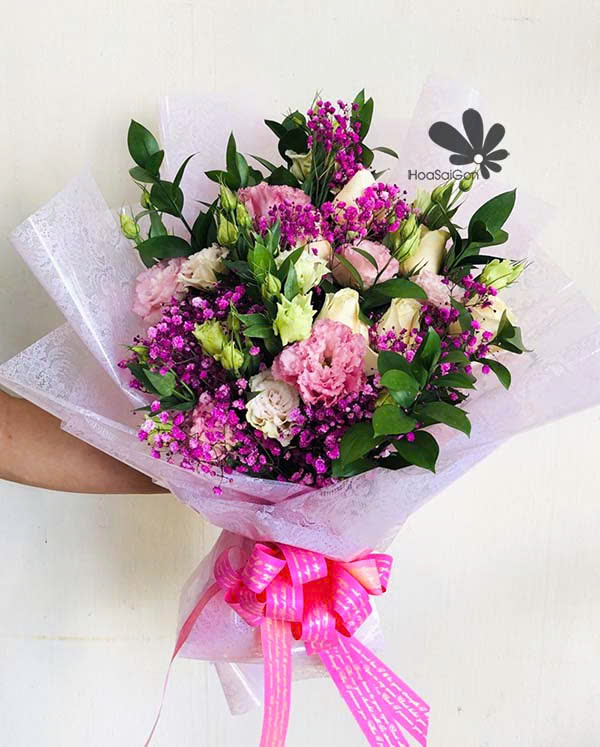 Bó hoa cát tường dịu dàng phối với hồng màu mỡ gà.