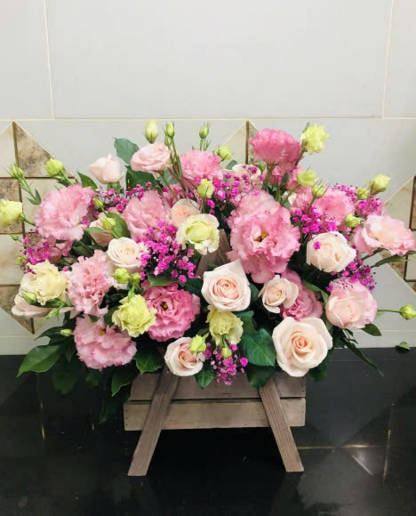Giỏ hoa là sự phối hợp giữa hoa hồng da, cát tường hồng và baby hồng hòa quyện rất đáng yêu.