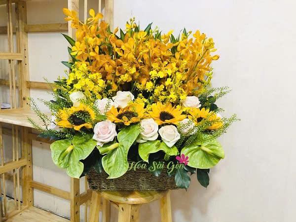 Với sự kết hợp hài hòa giữa hoa lan mokara, lan vũ nữ, hoa hướng dương, hoa hồng da