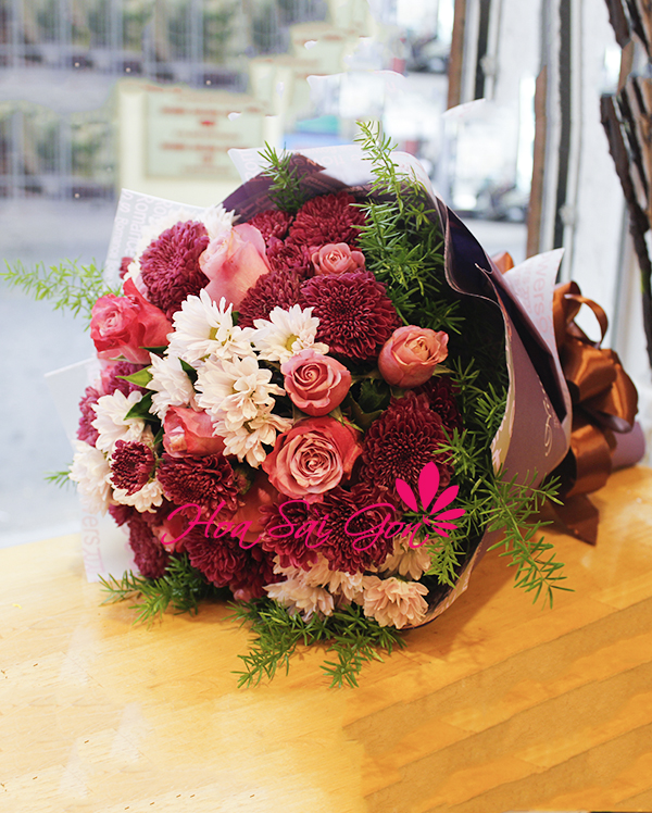 Hoa Sài Gòn đã cho ra đời rất nhiều mẫu hoa sinh nhật đẹp và Lời âu yếm chính là một trong số ấy. Bó hoa tặng sinh nhật chính là là sự kết hợp giữa những đóa hoa hồng dâu cùng với hoa cúc tím, hoa cúc trắng và cành lá phụ kiện. Sản phẩm được bó với phong cách tròn đơn giản nhưng vô cùng tinh tế là món quà ý nghĩa trong dịp sinh nhật.