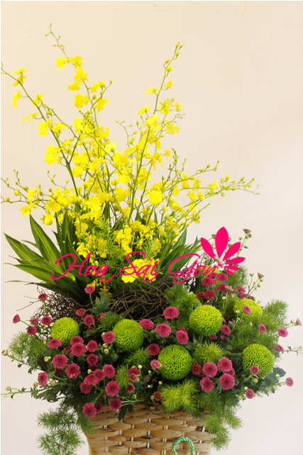 Lãng hoa sinh nhật Nhịp sống xanh chính là sự kết hợp giữa những đóa hoa cúc màu xanh, màu hồng và những cành lan vũ nữ màu vàng tươi tắn. Ngoài ra lãng hoa sinh nhật còn có sự hiện diện giữa những lá trúc bách hợp và những cành lá phụ khác để tạo nên.