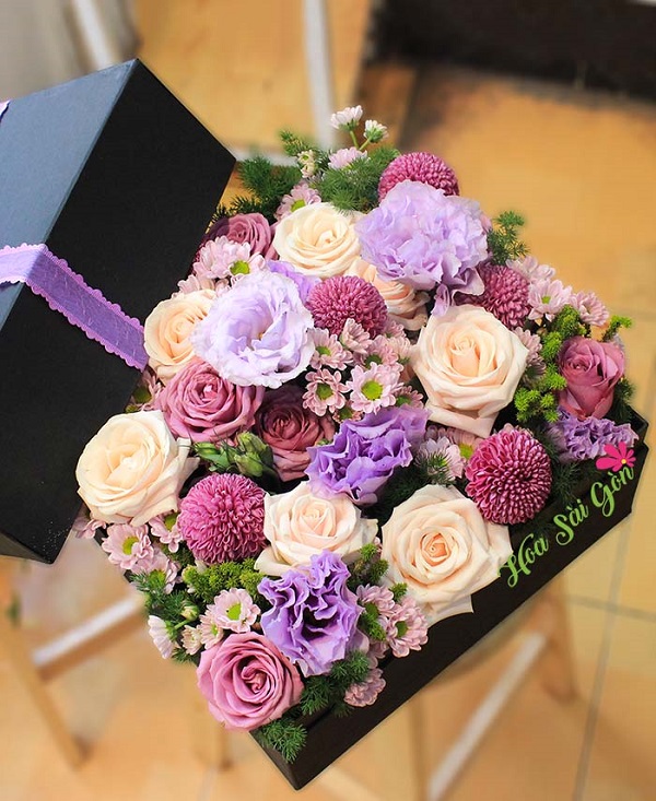 Hộp hoa với sự kết hợp tinh tế giữa 7 đóa hoa hồng da, 5 hoa hồng tím, 5 bing bong tím, cúc tím điểm xuyết thêm 5 bông hoa cát tường tím, sau đó trang trí thêm vài lá xanh phụ giúp hộp hoa trở thành khu vườn sinh động tươi mát.