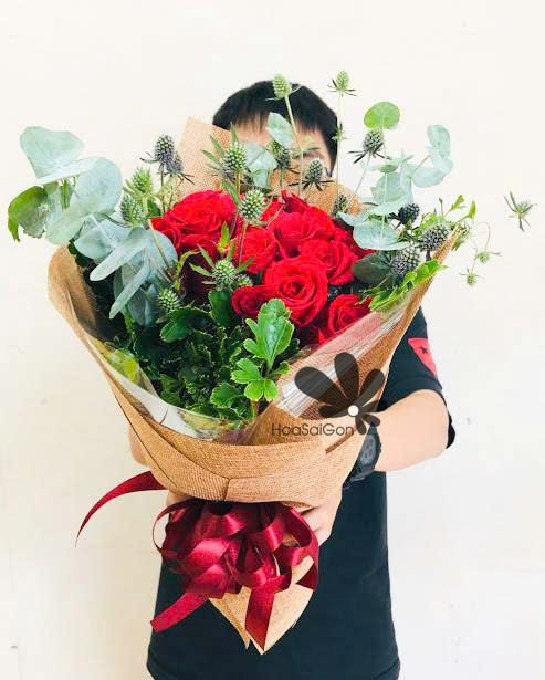 17 hồng đỏ, lá bạc và nhím biển góp phần tạo phong cách hoang dã cho bó hoa.