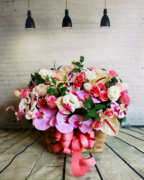 Giỏ hoa Uyên ương hồ điệp với sự kết hợp của rất nhiều loại hoa khác nhau