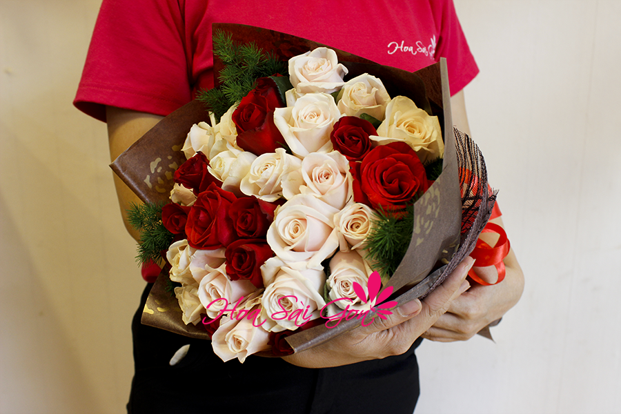 Bó hoa Một chút yêu chính là món quà đơn giản nhưng vô cùng thân thương và ý nghĩa mà bạn có thể dành tặng cho người ấy của mình vào dịp Valentine sắp đến. 11 đóa hoa hồng đỏ được xếp xen kẽ với 19 đóa hoa hồng dầu tạo nên vẻ đẹp mới mẻ cho bó hoa. Đặc biệt xen kẽ vào đó chính là những cành lá phụ kiện màu xanh xanh để tạo nên nét đẹp tuyệt vời nhất.