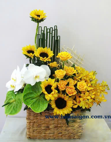 Giỏ hoa lan mokara vàng, hoa hướng dương, hồ điệp trắng và lục môn tạo giỏ hoa sang trọng.