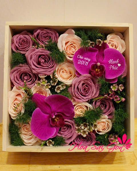 Hộp hoa chính là sự kết hợp giữa những đóa hoa hồng da, hồng tím và đặc biệt với sự hiện diện của đóa lan hồ điệp in chữ “Chúc mừng 20/11” “Hạnh phúc”. Tất cả tạo nên lời chúc chân thành thân thương cho thầy cô của mình vào ngày nhà giáo Việt Nam! Lời chúc chân thành và ý nghĩa từ trái tim này chắc chắn sẽ khiến cho thầy cô của chúng ta cảm nhận được tình cảm chân thành thân thương mà người nhận đã trao gửi!