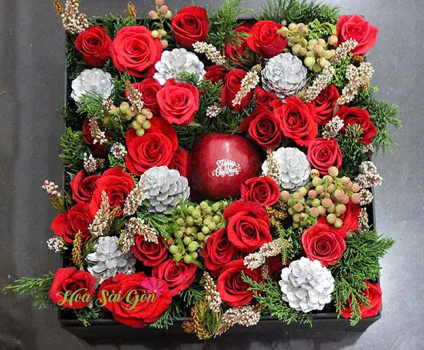Ở giữa hộp hoa còn có sự điểm xuyết của quả táo mỹ in thông điệp "Merry Christmas" độc đáo