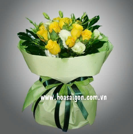 Bó hoa là sự kết hợp giữa 12 hồng vàng và cát tường trắng