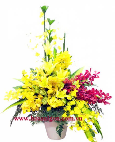 Bình hoa là sự kết hợp của hoa vũ nữ, lan mokara vàng, mokara đỏ và lyly vàng.