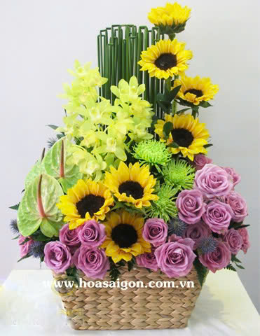 Giỏ hoa sang trọng với sự kết hợp của hồng tím, hương dương, địa lan, lục môn.