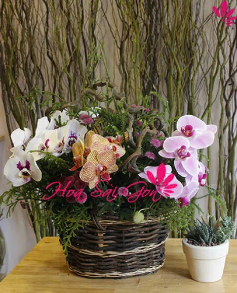 Lan hồ điệp nhiều màu kết hợp với nhau tạo nên giỏ hoa sang trọng.