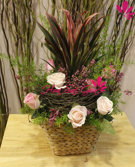 Sự kết hợp giữa tổ chim, hoa hồng dâu, hồng da, và hoa phụ khác.