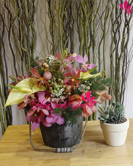 giỏ hoa kết hợp nhiều loại hoa lạ