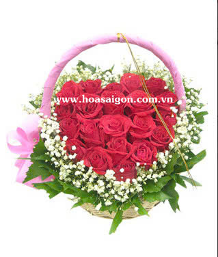 Giỏ hoa gồm 21 hoa hồng đỏ kết hình trái tim, bên ngoài là babi trắng.