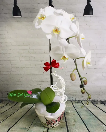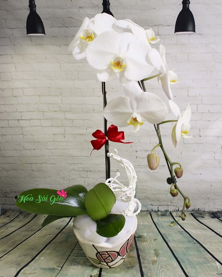 Đặc biệt nhành lan hồ điệp màu trắng ngây thơ và thanh thoát khi đặt bên trong căn phòng còn giúp không gian trở nên rạng rỡ và tươi vui hơn. Sức sống như được truyền cho tất cả mọi người để có thêm nguồn sinh khí cho một ngày dài làm việc hiệu quả hơn rất nhiều. Liên hệ ngay với Hoa Sài Gòn để được sở hữu chậu lan siêu xinh tươi này bạn nhé! (Lưu ý là hoa văn chậu lan thay đổi theo từng thời điểm).
