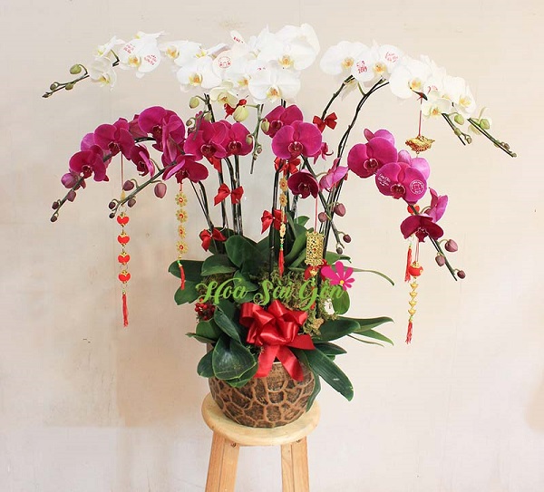 Chậu hoa với sự kết hợp của 4 cành lan hồ điệp tím dịu dàng và 5 cành lan hồ điệp trắng tinh khôi cùng một số phụ kiện trang trí xinh xắn mang đến không khí xuân vui tươi đồng thời mang lại tài lộc cả năm cho gia chủ. Hơn nữa, trên mỗi cánh hoa lan còn in những câu chúc về năm mới vô cùng độc đáo thay người tặng trao gửi tấm lòng thành.