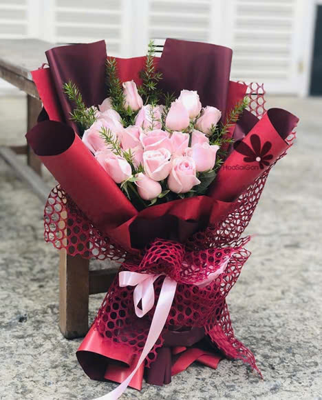 Bó hoa Still Loving You HSG321 mang màu sắc tươi xinh của những 18 bông hồng da cùng giấy gói đỏ khoe sắc.
